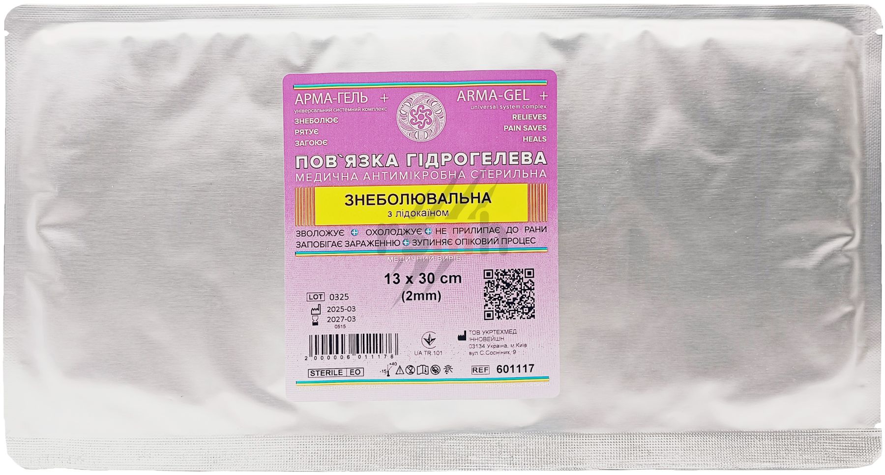 Пов`язка гідрогелева АРМА-ГЕЛЬ+ Знеболювальна з лідокаїном 13×30 см (2мм)