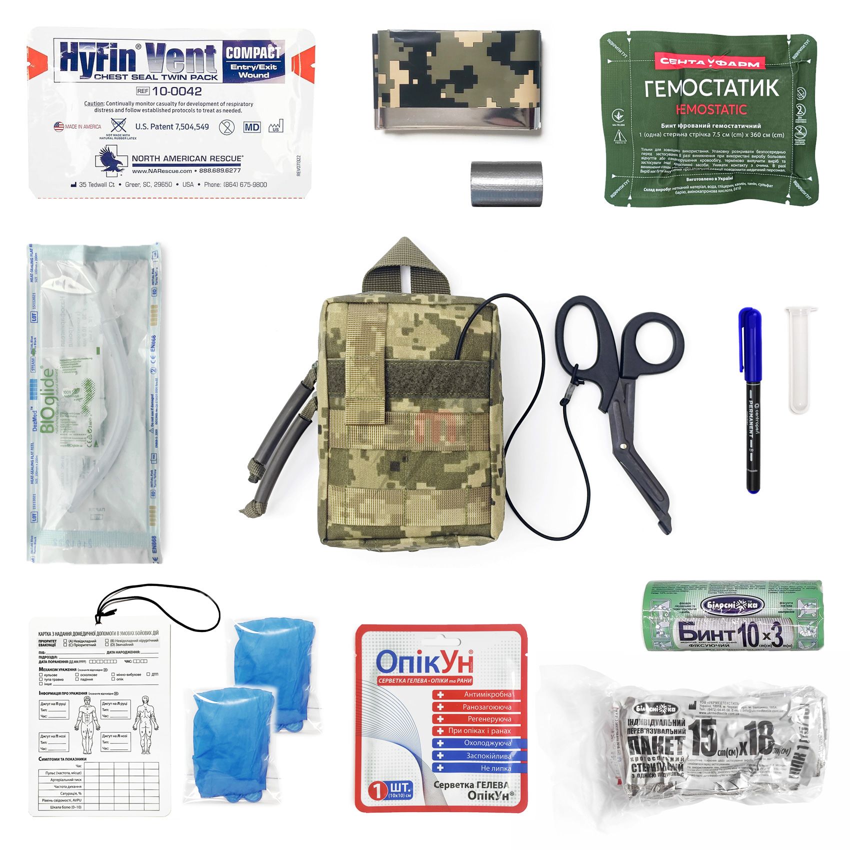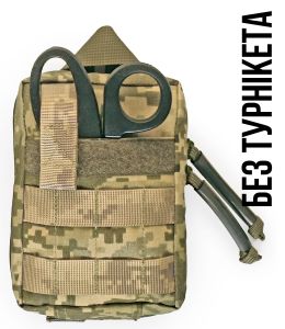 Надкомпактна аптечка, укомплектована засобами першої необхідності для надання домедичної допомоги у випадку проникних та інших бойових поранень і оснащена спереду і ззаду системою MOLLE і безшумною системою швидкого скидання.