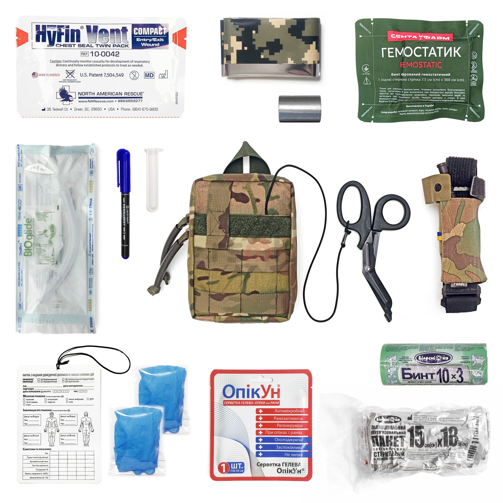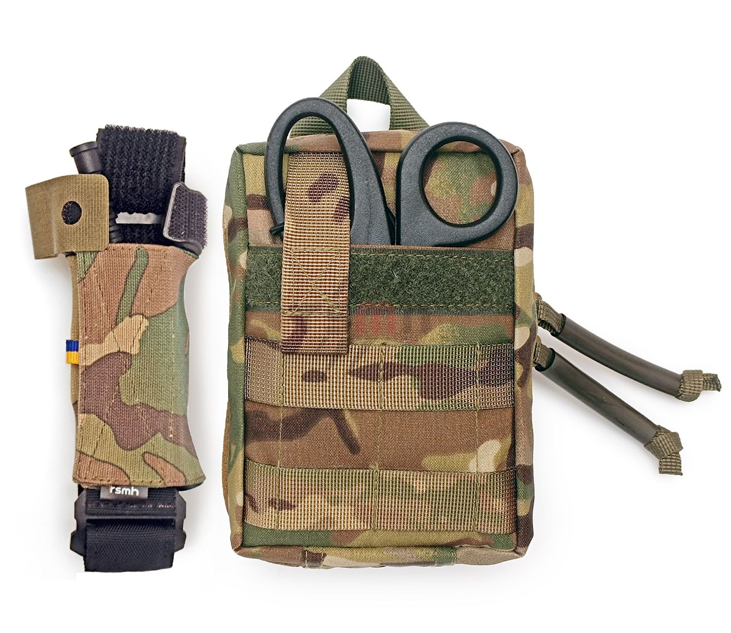 Надкомпактна аптечка, укомплектована засобами першої необхідності для надання домедичної допомоги у випадку проникних та інших бойових поранень і оснащена спереду і ззаду системою MOLLE і безшумною системою швидкого скидання. Не візуалізується приладами нічного бачення.