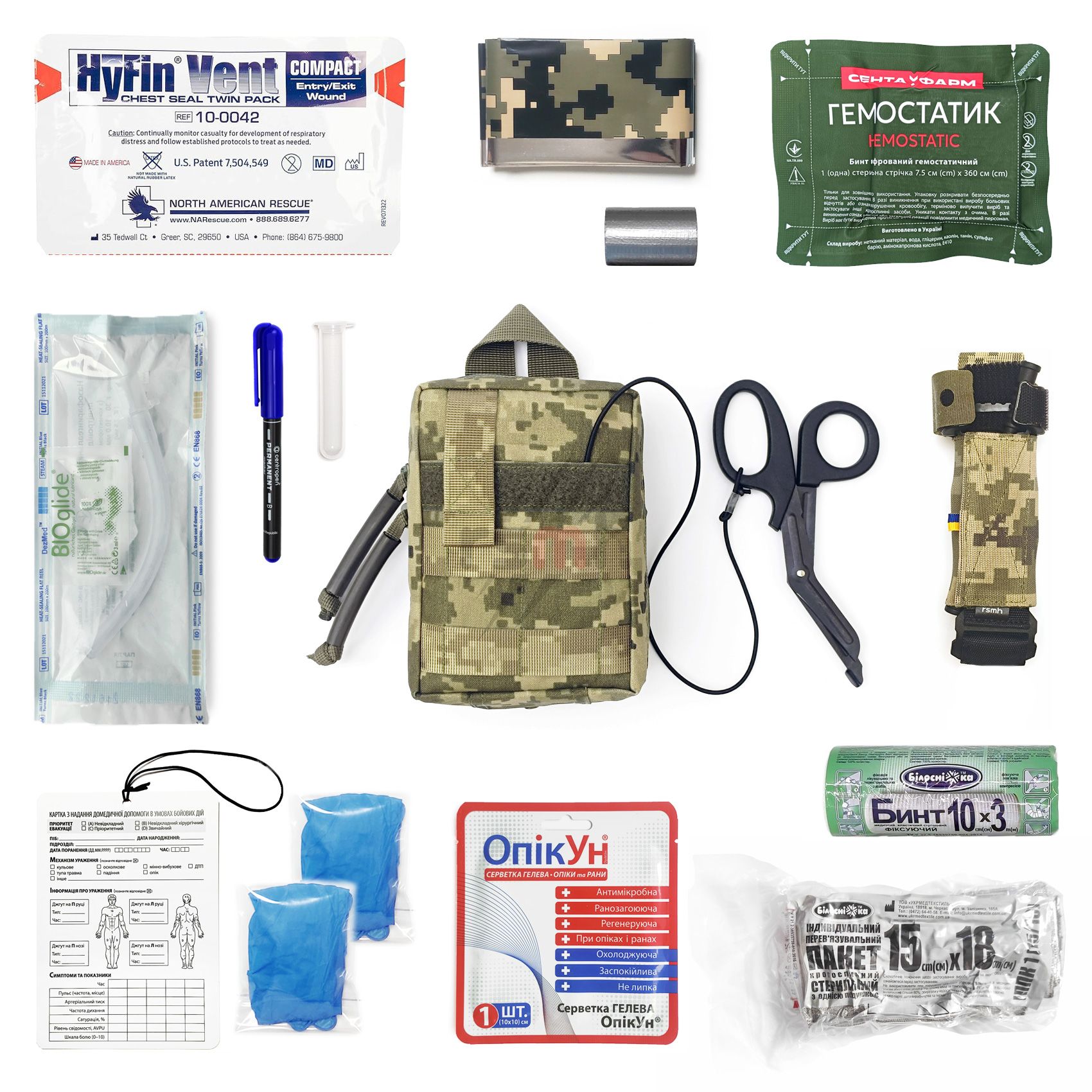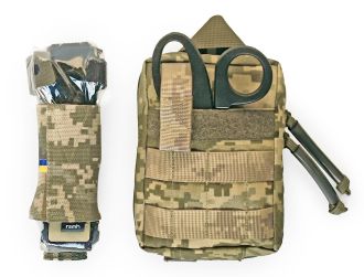 Надкомпактна аптечка, укомплектована засобами першої необхідності для надання домедичної допомоги у випадку проникних та інших бойових поранень і оснащена спереду і ззаду системою MOLLE і безшумною системою швидкого скидання.
