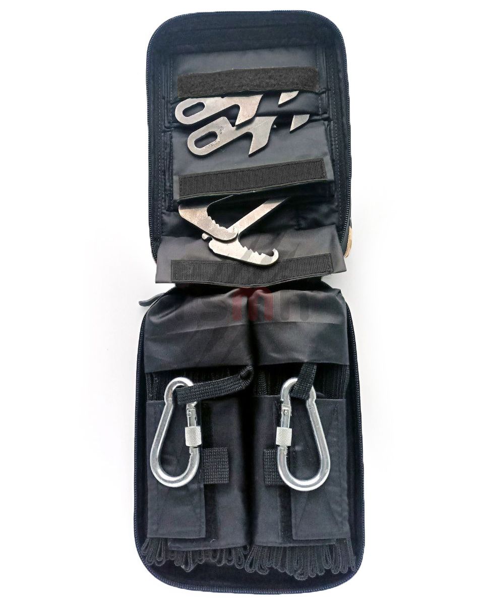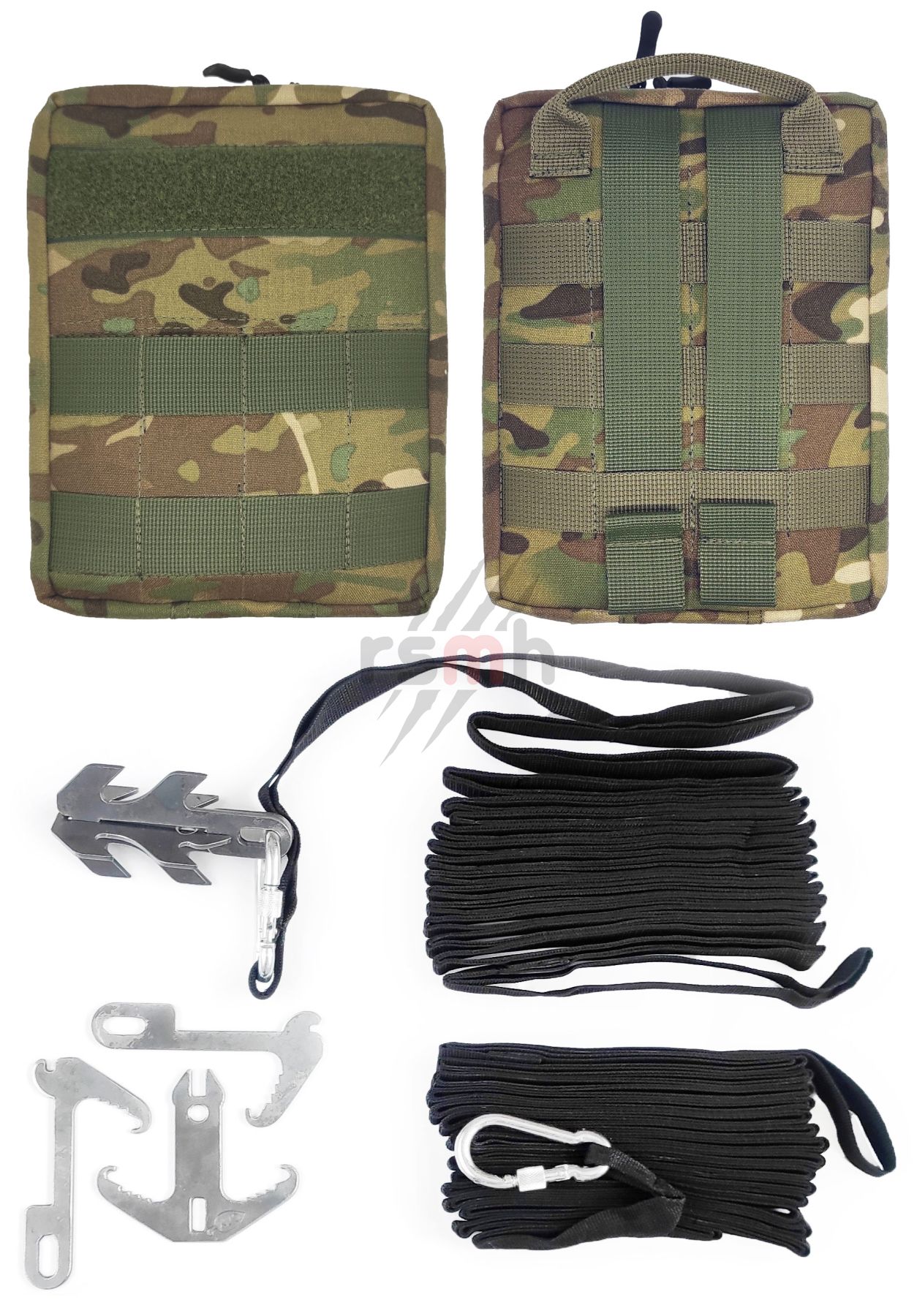 2. Дві стропи: 25 мм (або 40 мм) на 6 метрів кожна; дві паралельні ремінні стрічки прошиті кожні 40 см, утворюючи петлі для перехвату руками, одна з паралельних стрічок перекручена для зручності швидкого просування між ними пальців руки; два карабіни з закрутками 8*80 мм.