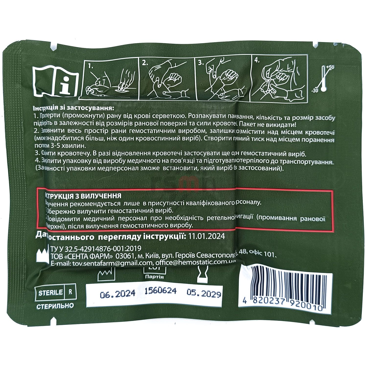 Тільки для зовнішнього використання. Якщо пакет пошкоджений або відкритий, стерильність виробу не гарантується і його слід викинути. Виріб повторному використанню не підлягає. Повторна стерилізація не можлива. В разі виникнення при використанні виробу больових відчуттів або ознак порушення кровообігу, терміново вилучити виріб та застосувати інші кровоспиннi засоби. Пакування розкривати безпосередньо перед застосуванням. Уникати контакту з очима, як і контакту пальців очима, після контакту із виробом. У разі виникнення місцевої або загальної реакції, повідомити медичний персонал. Вилучення бинта дозволяється лише у присутності кваліфікованого персоналу. Засіб має бути вилучений протягом 24 годин. Виготовлено в Україні.
