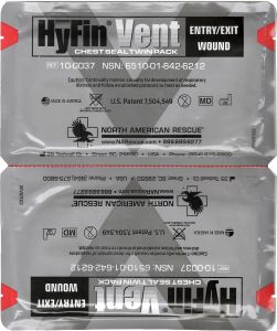 HyFin Vent Chest Seal Twin Pack від North American Rescue — це набір з двох оклюзійних пов'язок, призначених для лікування відкритого та/або напруженого пневмотораксу, що може виникнути внаслідок проникаючих поранень грудної клітки.