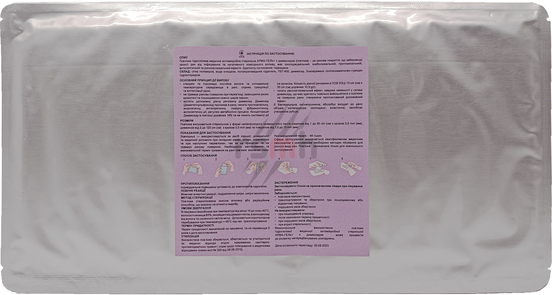 Пов`язки гідрогелеві стерильні медичні«АРМА-ГЕЛЬ+» з димексидом насичуються допоміжним лікарським засобом димексидом (Dimexidum), який посилює протизапальний, аналгетичний, антисептичний, фібринолітичний ефекти. Концентрація димексиду в пов’язці не перевищує 20%.