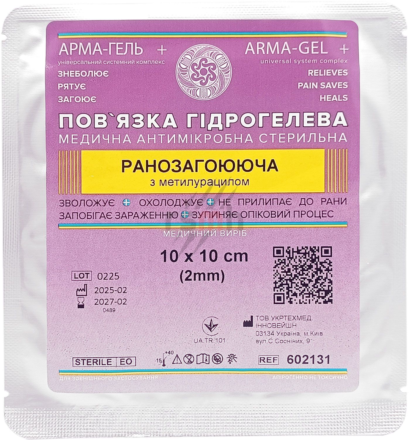 Пов`язка гідрогелева АРМА-ГЕЛЬ+ Ранозагоююча з метилурацилом 10×10 см (2мм)
