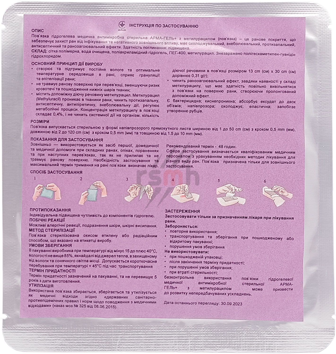 Пов`язки гідрогелеві стерильні медичні «АРМА-ГЕЛЬ+» з метилурацилом призначаються лікарем з урахуванням необхідної методики лікування. Пов’язка поглинає ексудат, який виділяється з рани. За рахунок сітчастої матриці пов’язка здатна поглинати великий об’єм виділень не руйнуючись. Одночасно з цим лікарський засіб, який знаходиться в полімерній матриці пов’язки, повільно виділяється та проникає в рану, створюючи пролонгований лікувальний ефект. Завдяки дренажним та сорбційним властивостям пов’язки некротичні утворення розм’якшуються, що дозволяє досить легко їх видаляти з рани.