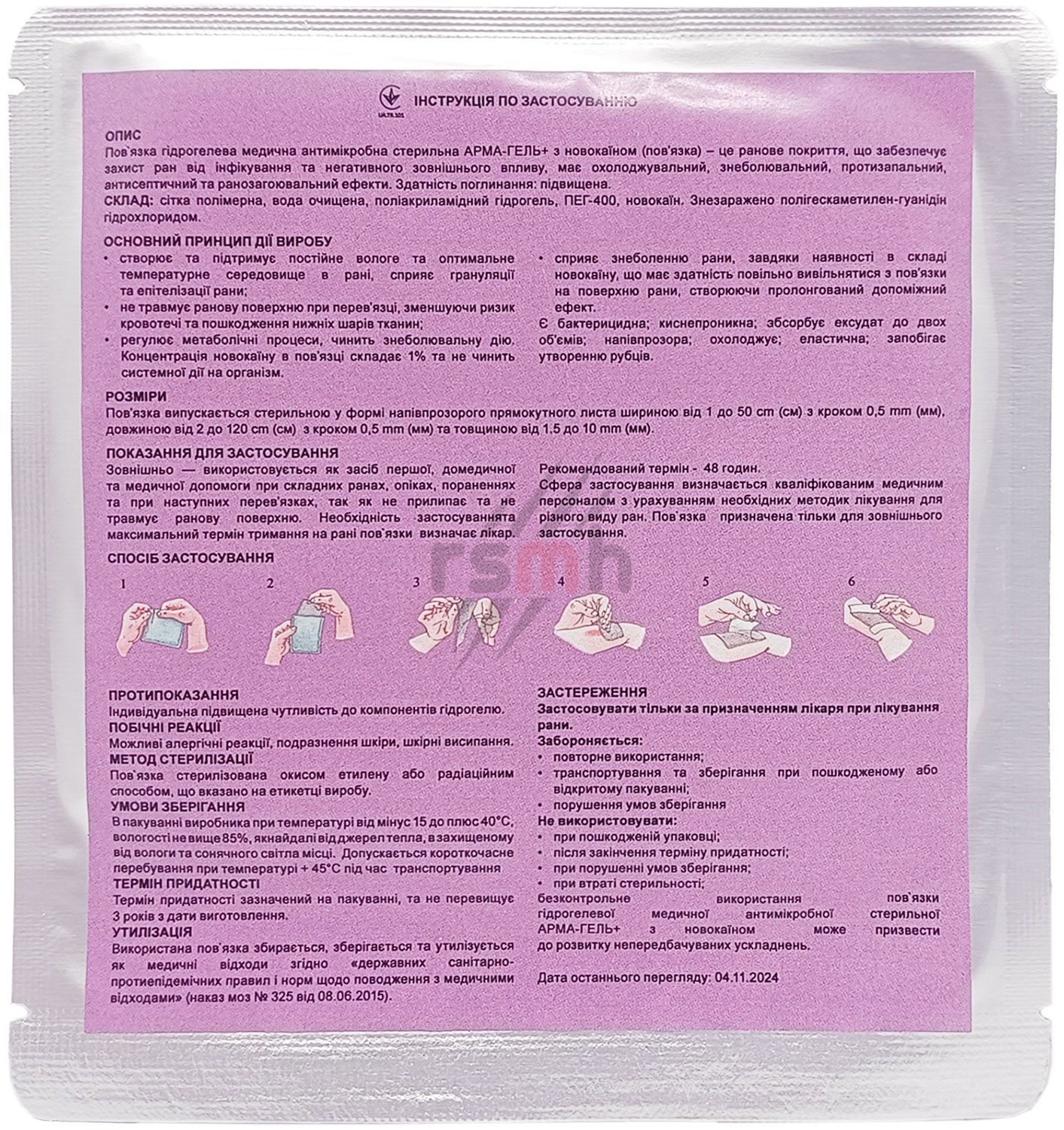 Пов`язкі гідрогелеві стерильні медичні«АРМА-ГЕЛЬ+» з новокаїномпризначаються лікарем з урахуванням необхідної методики лікування. Пов’язка поглинає ексудат, який виділяється з рани. За рахунок сітчастої матриці пов’язка здатна поглинати великий об’єм виділень не руйнуючись. Одночасно з цим лікарський засіб, який знаходиться в полімерній матриці пов’язки, повільно виділяється та проникає в рану, створюючи пролонгований лікувальний ефект. Завдяки дренажним та сорбційним властивостям пов’язки некротичні утворення розм’якшуються, що дозволяє досить легко їх видаляти з рани. Лікарський засіб НОВОКАЇН додає місцеву анестезуючу дію, знімає біль при складних ранах.
