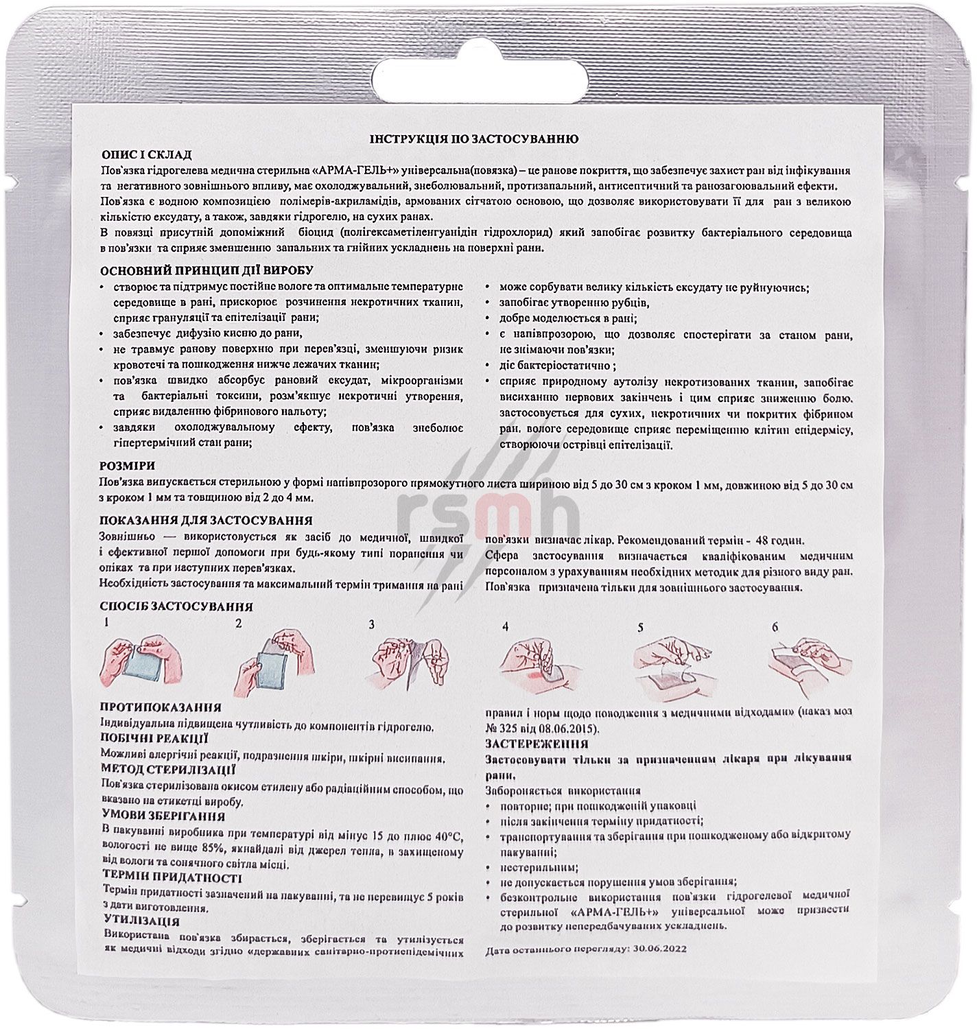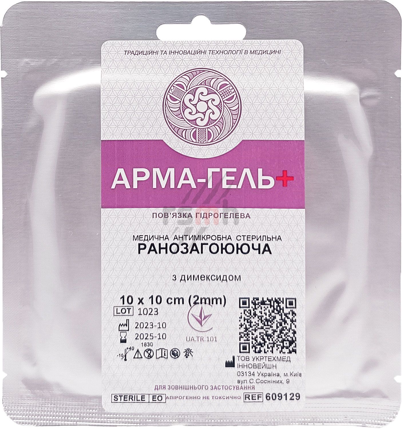 Пов`язка гідрогелева АРМА-ГЕЛЬ+ Ранозагоююча з димексидом 10×10 см (2мм)