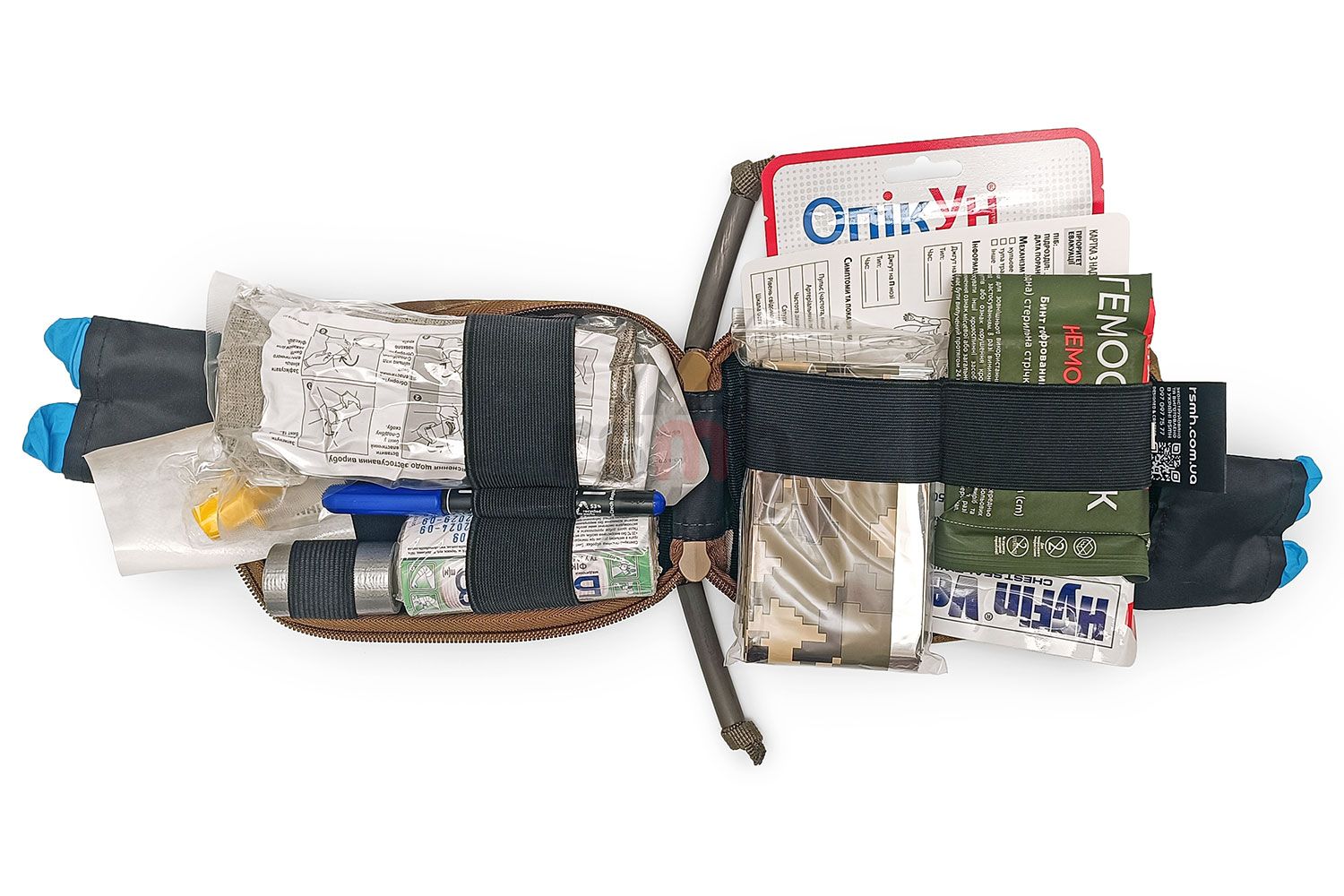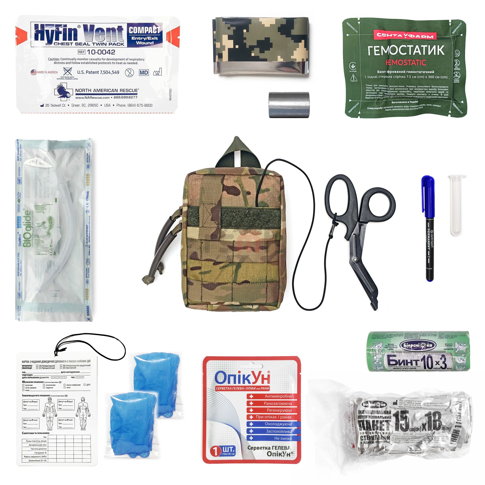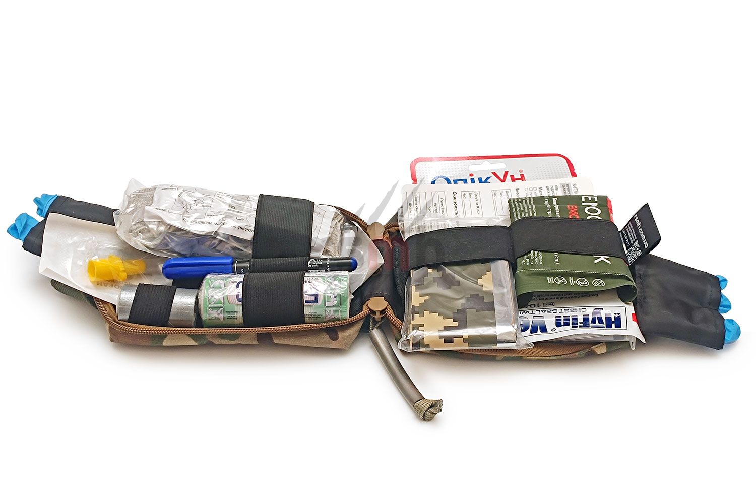 Надкомпактна аптечка, укомплектована засобами першої необхідності для надання домедичної допомоги у випадку проникних та інших бойових поранень і оснащена спереду і ззаду системою MOLLE і безшумною системою швидкого скидання. Не візуалізується приладами нічного бачення.